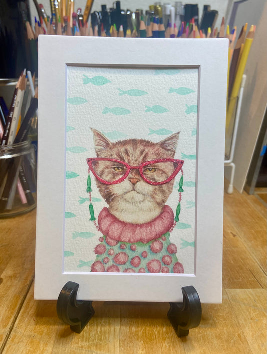 Cat Eyes embellished print, cat lover, feline art, cat art, cat with glasses