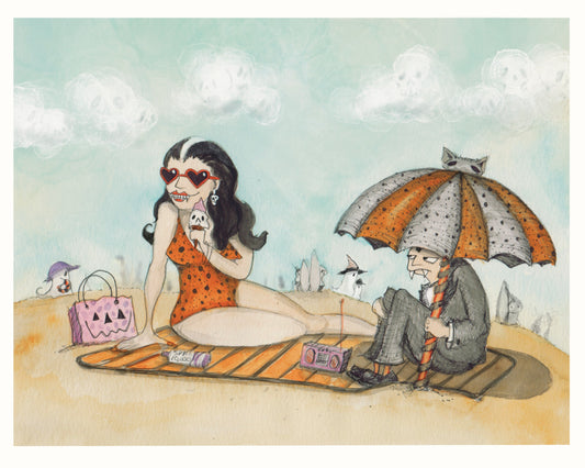 Hattie's Haunted Holiday Print, Spooky Art Decor, Witch Beach, Halloween Decor Witchy Friends, Summerween, pumpkin art