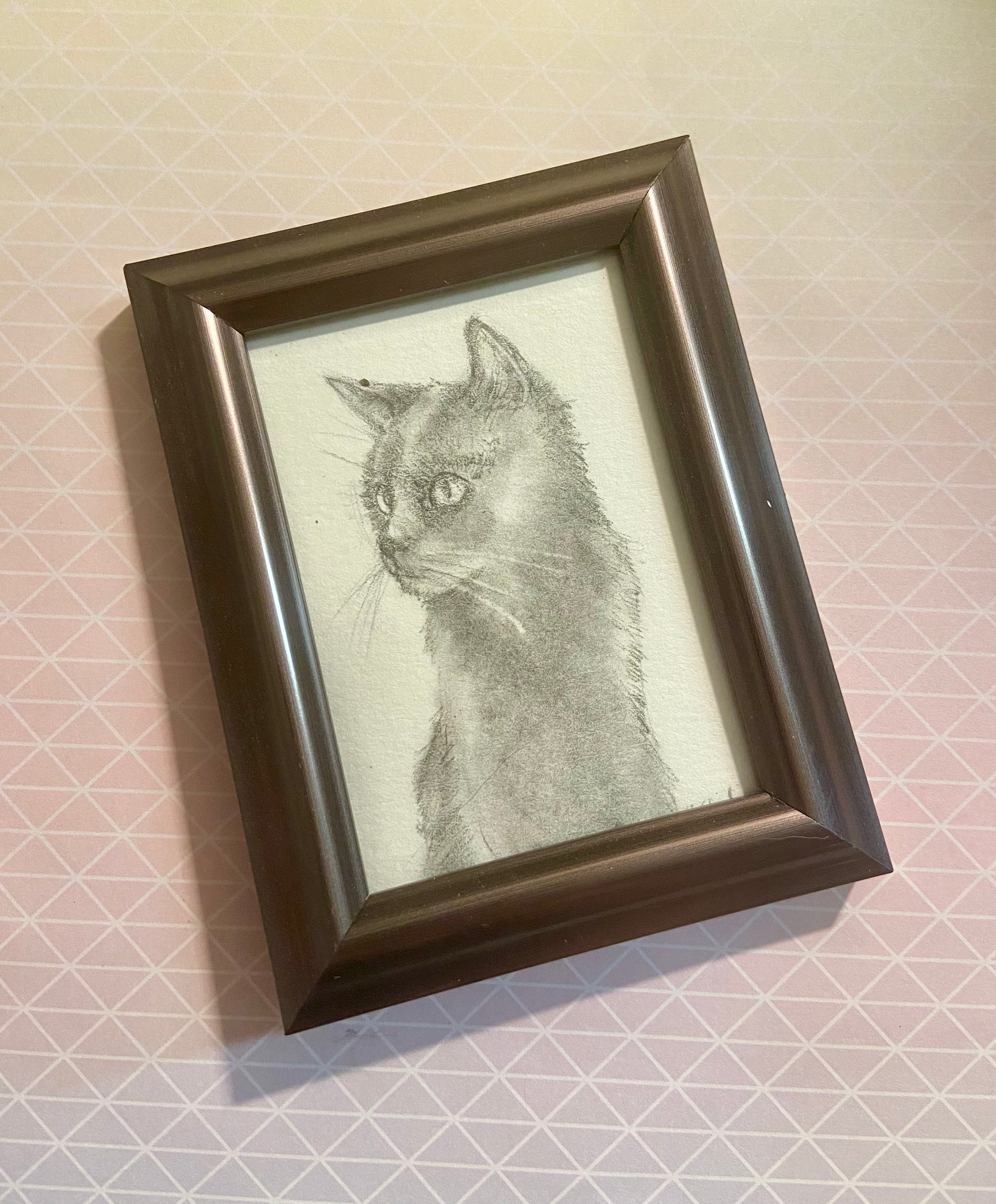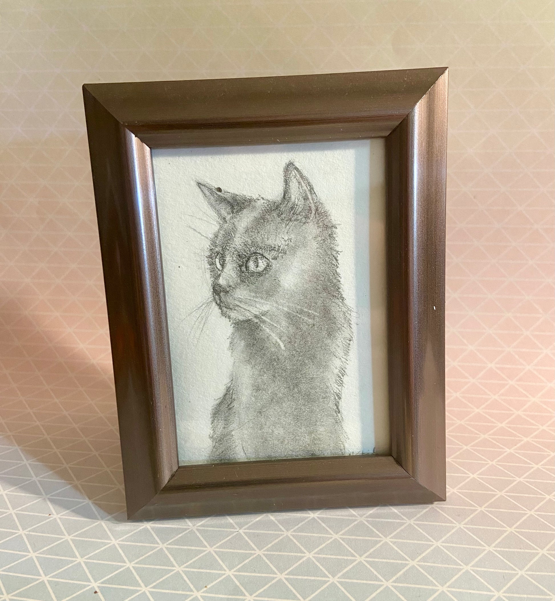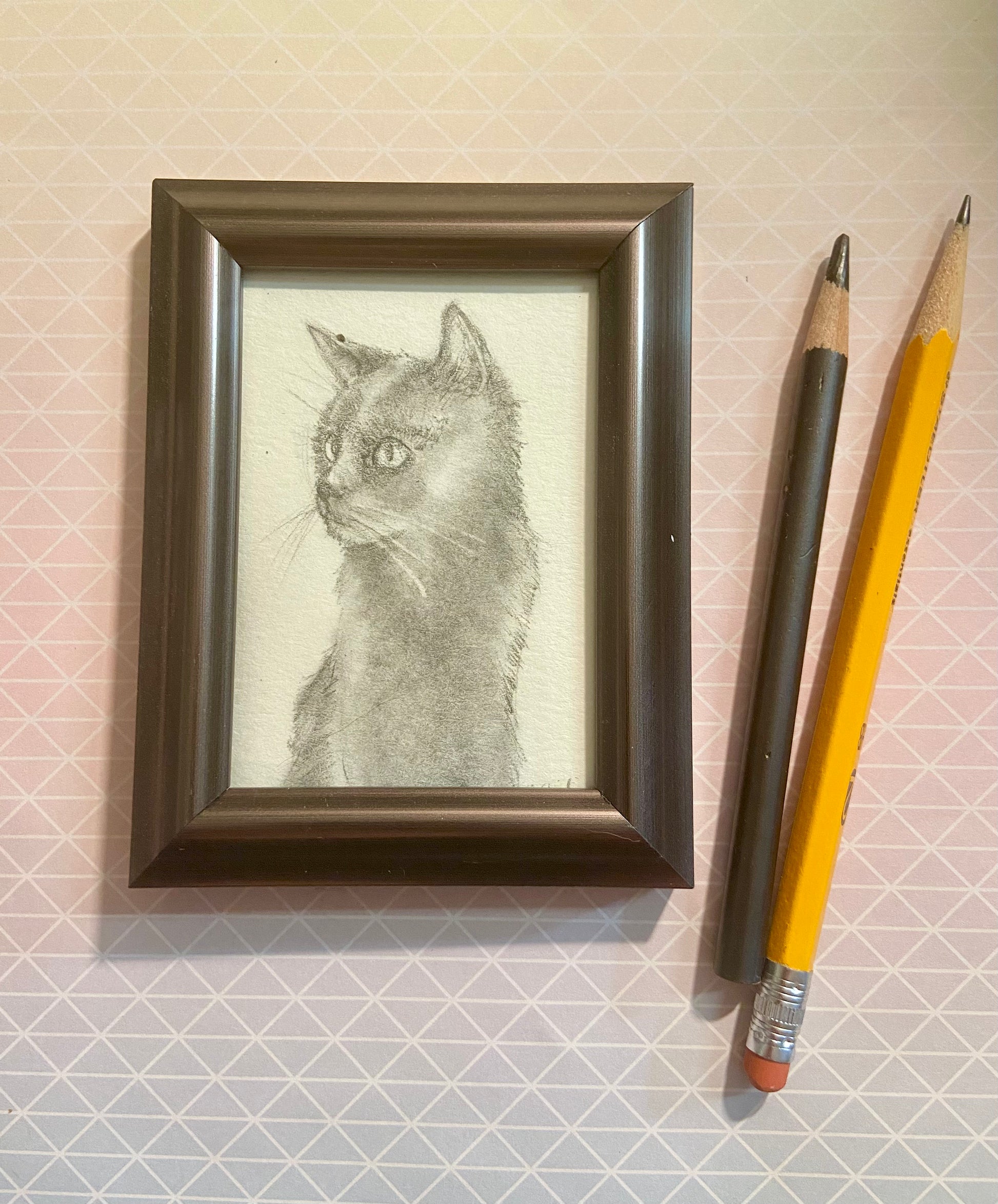 Drawn with graphite on Strathmore watercolor paper - framed in charcoal grey frame that is 3.5 x 4.5 inches in size.
