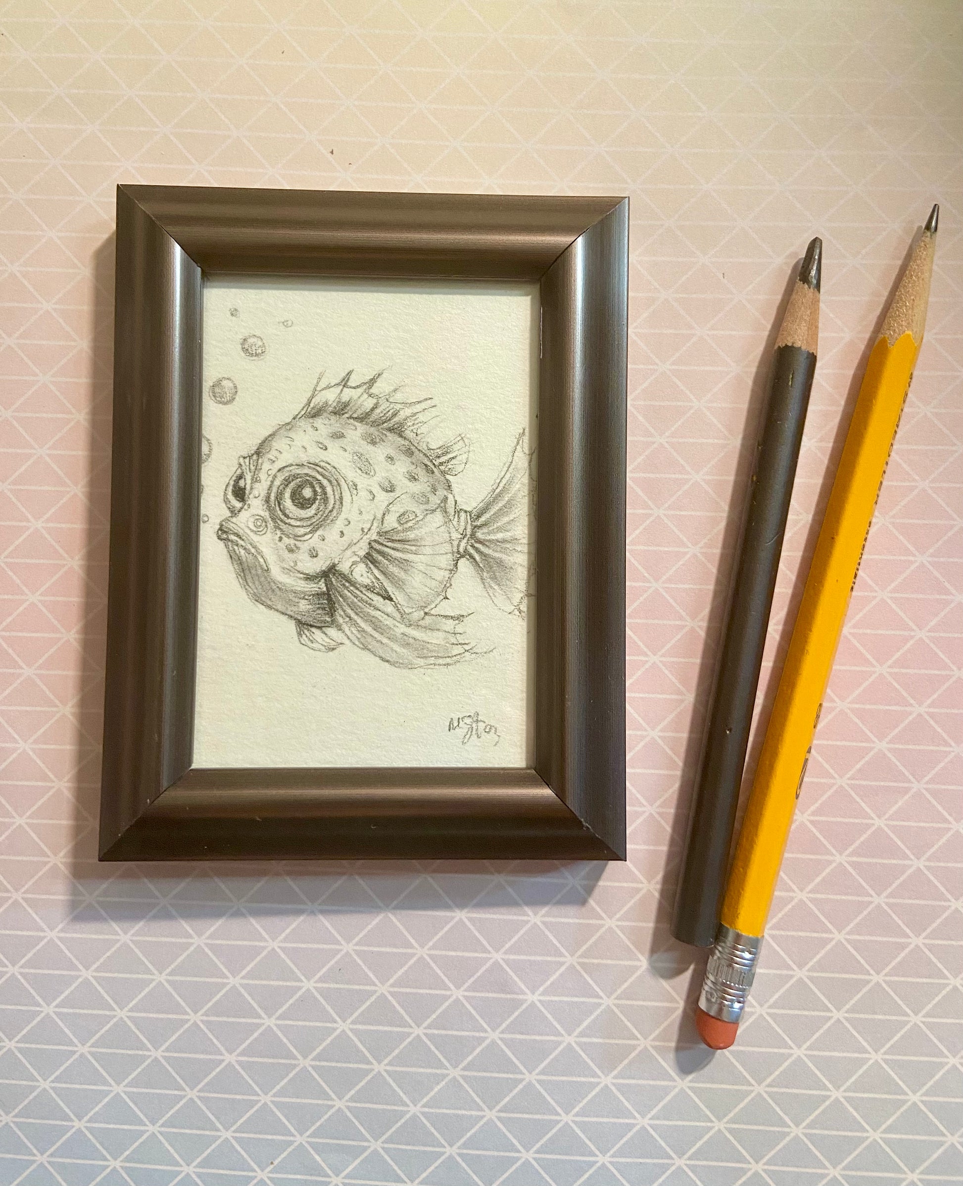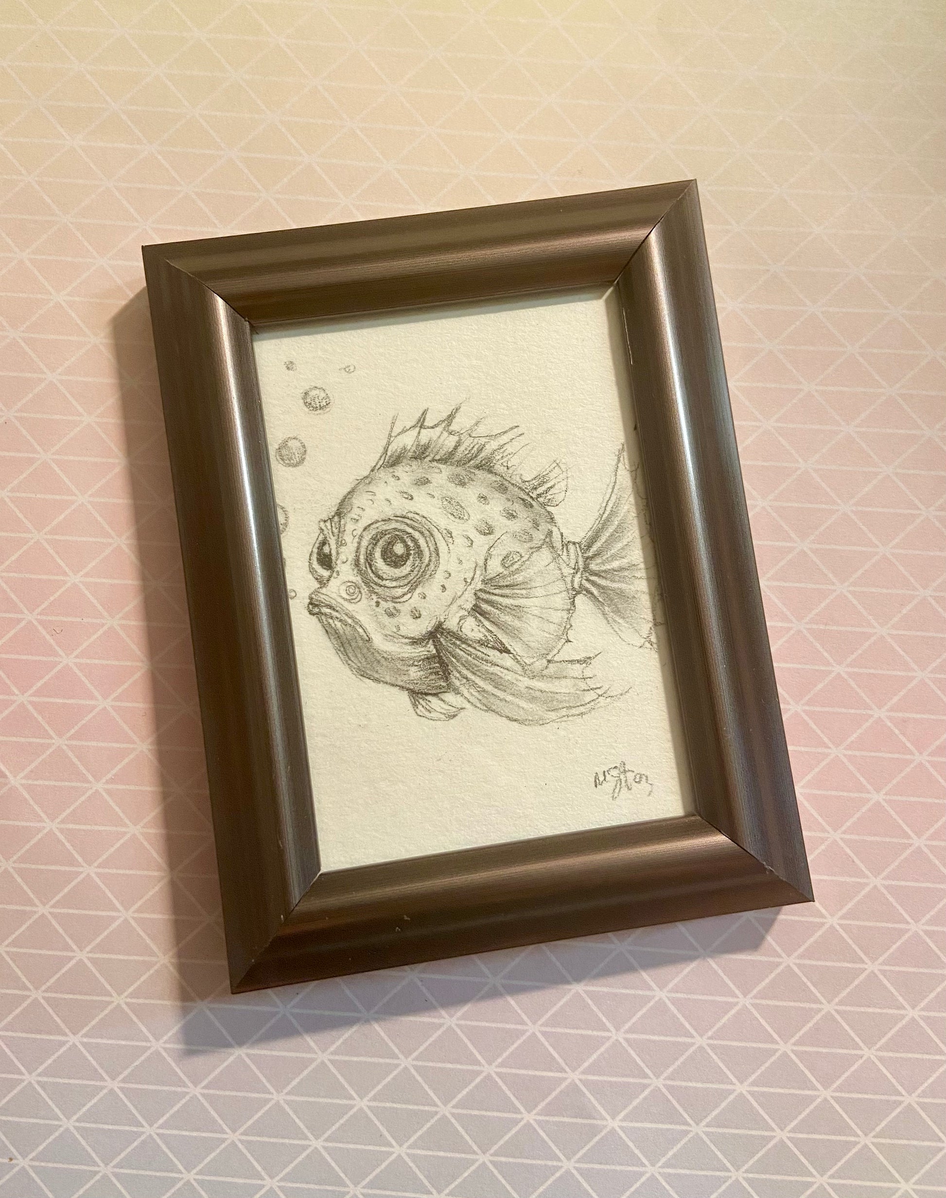 Swim into creativity with our ORIGINAL Funny Fish pencil drawing! This playful piece of aquatic art will add a splash of color and humor to any space. The detailed fish design is beautifully framed and ready to hang. A fin-tastic addition to your den or aquarium.