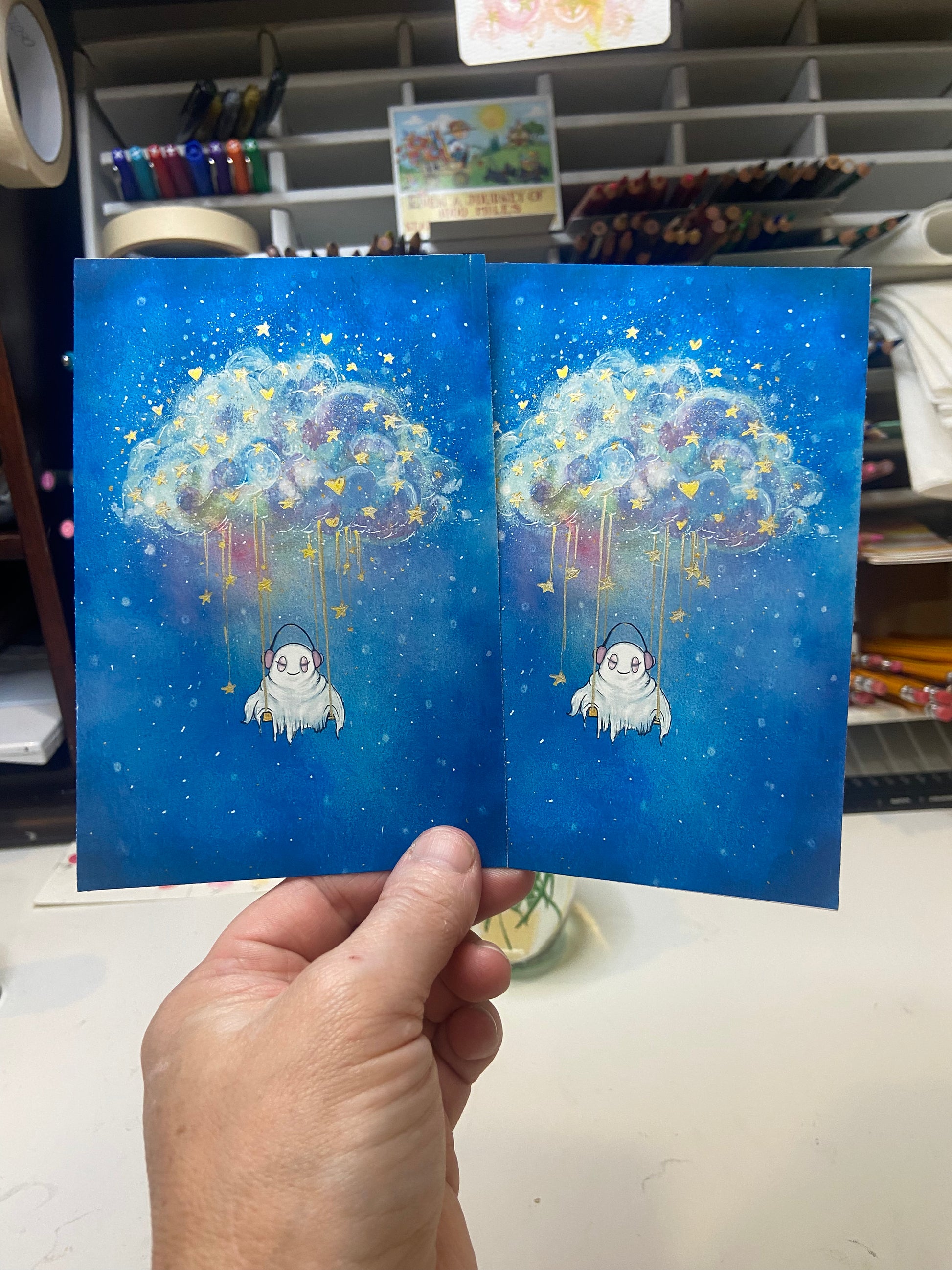 Original art printed on premium matte white paper, 4 x 6 inches in size, embellished with gold gel pen and a light coating of gloss sealer. There will be only 13 - numbered and signed by artist.