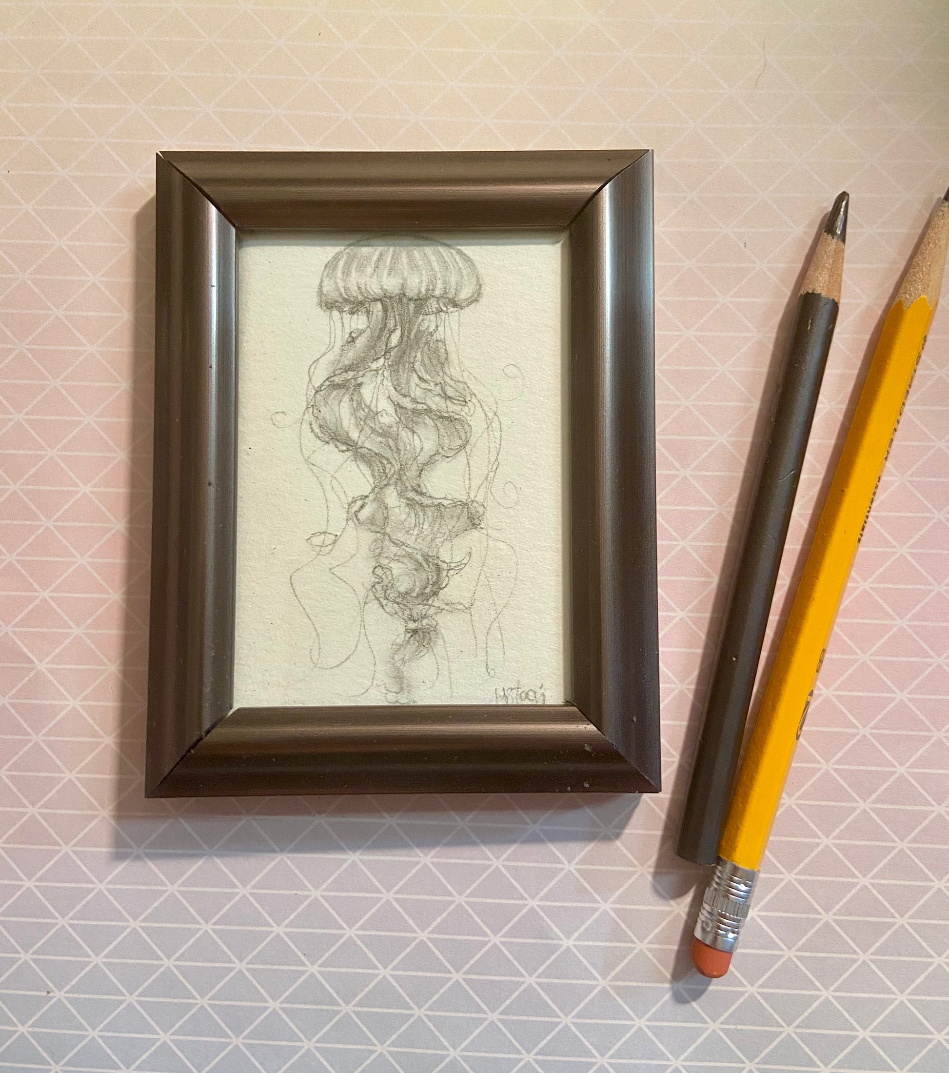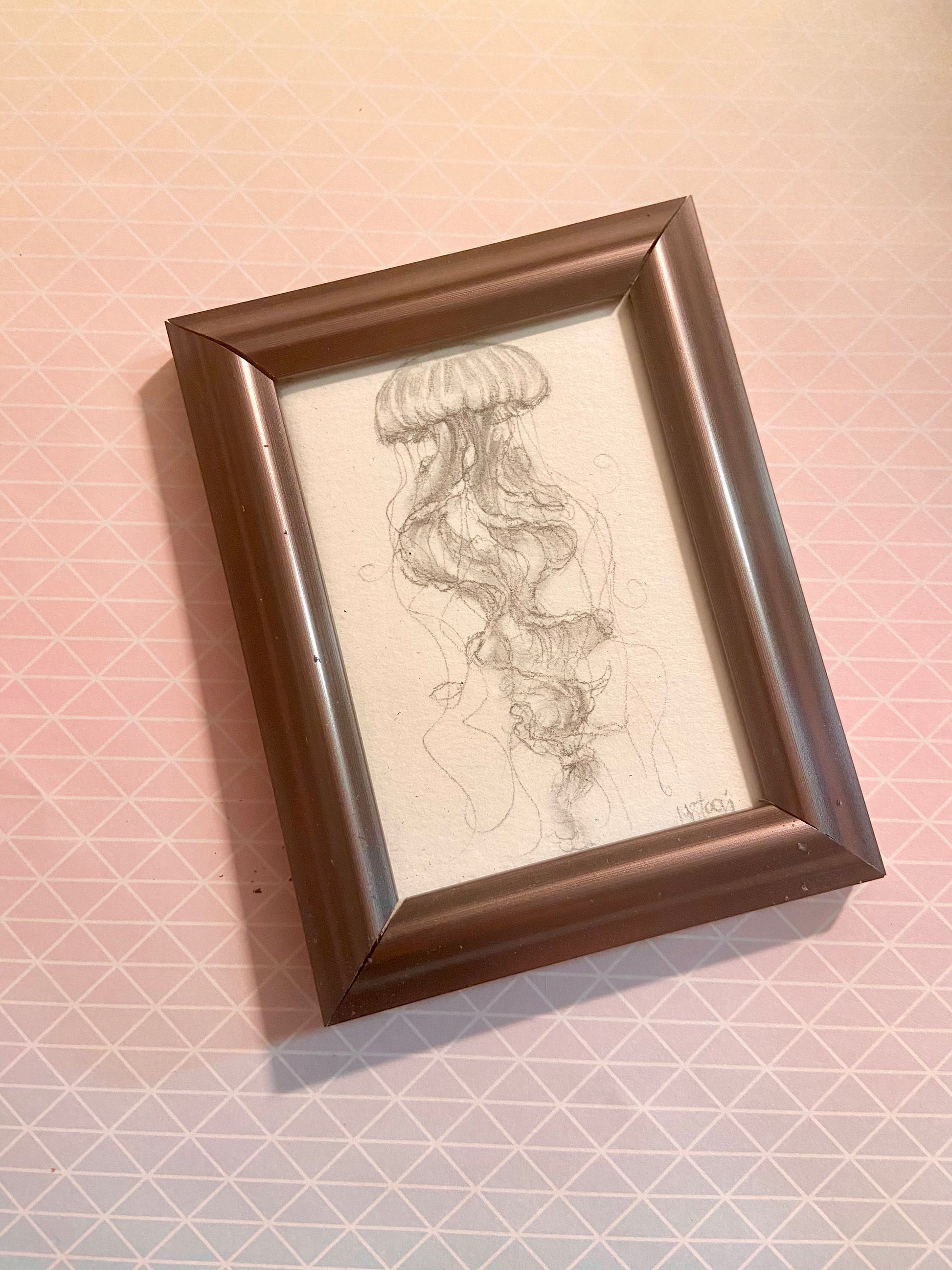 Make a splash with this original Jellyfish Pencil Drawing! Perfect for adding a touch of whimsy and color to any room. This piece is hand-drawn and framed for an extra special touch. Bring some aquatic charm to your decor with this bright and playful art piece.