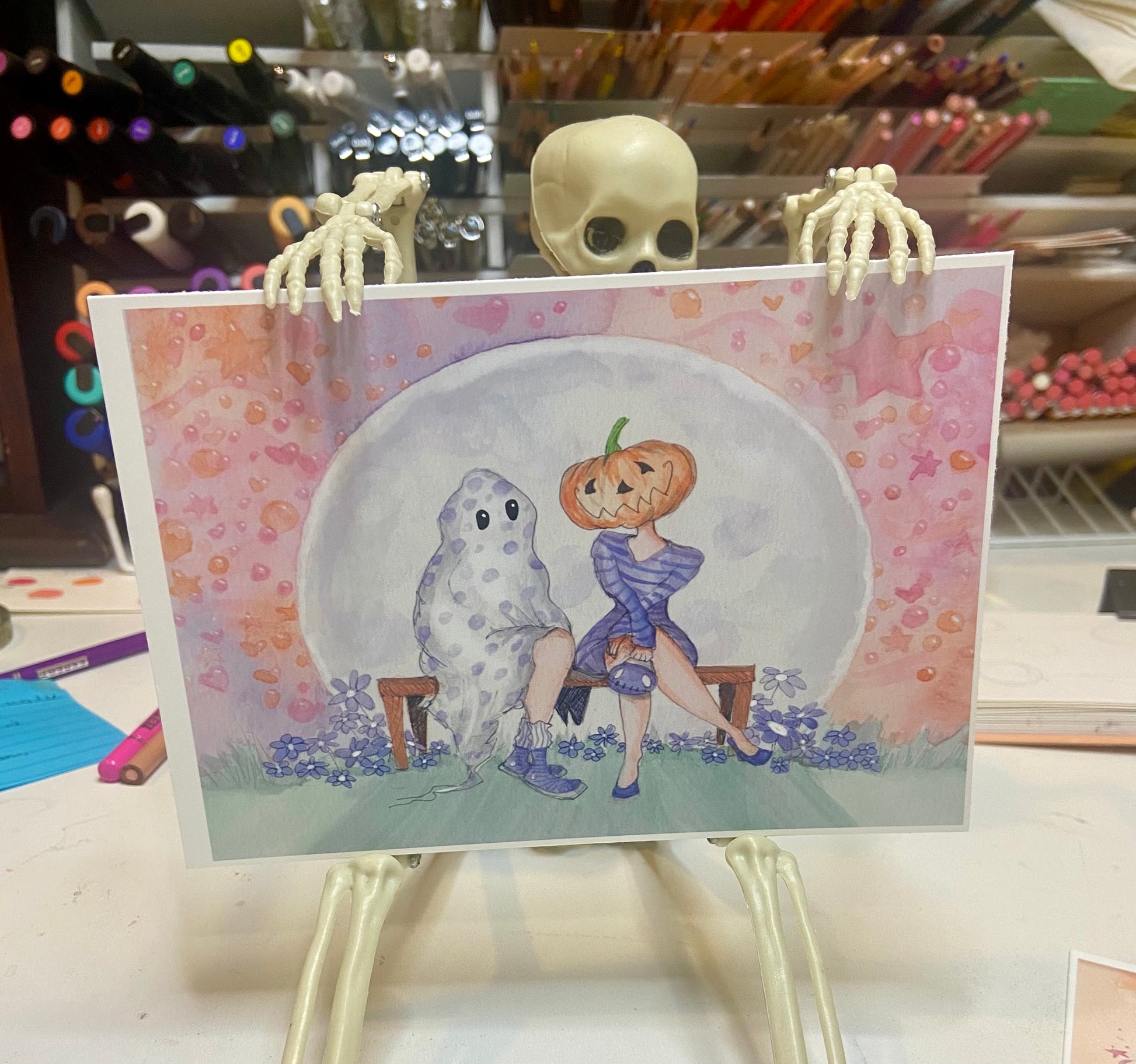 Capture the magic of a whimsical night with the Moonlight Meet Cute print. Featuring an adorable couple on a charming date, this playful artwork adds a touch of spooky sweetness to your Halloween or witchy decor. Perfect for creating cozy, enchanting vibes in any space.