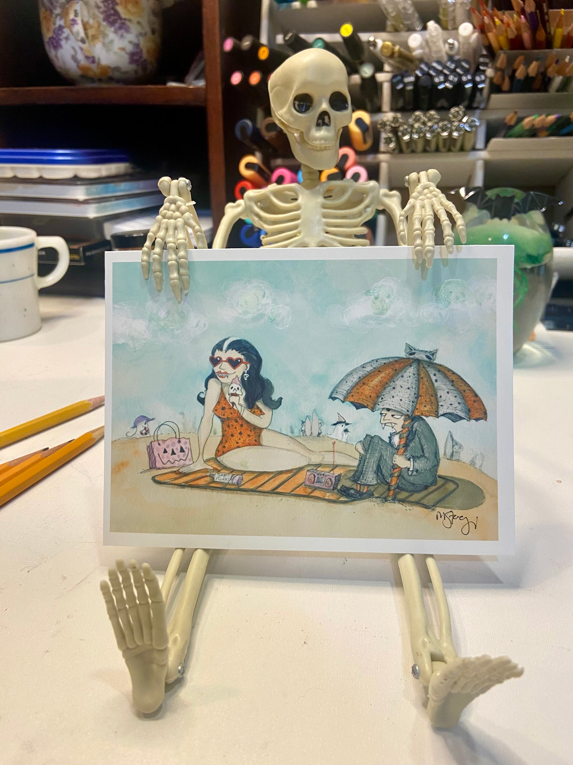 Bring a playful twist to your Halloween and summer decor with the Noseferasun Spooky Art Decor. Featuring quirky vampires enjoying a beach day, this unique piece blends spooky vibes with sunny fun, perfect for adding a whimsical touch to your Witchy Friends collection or Summerween celebrations.
