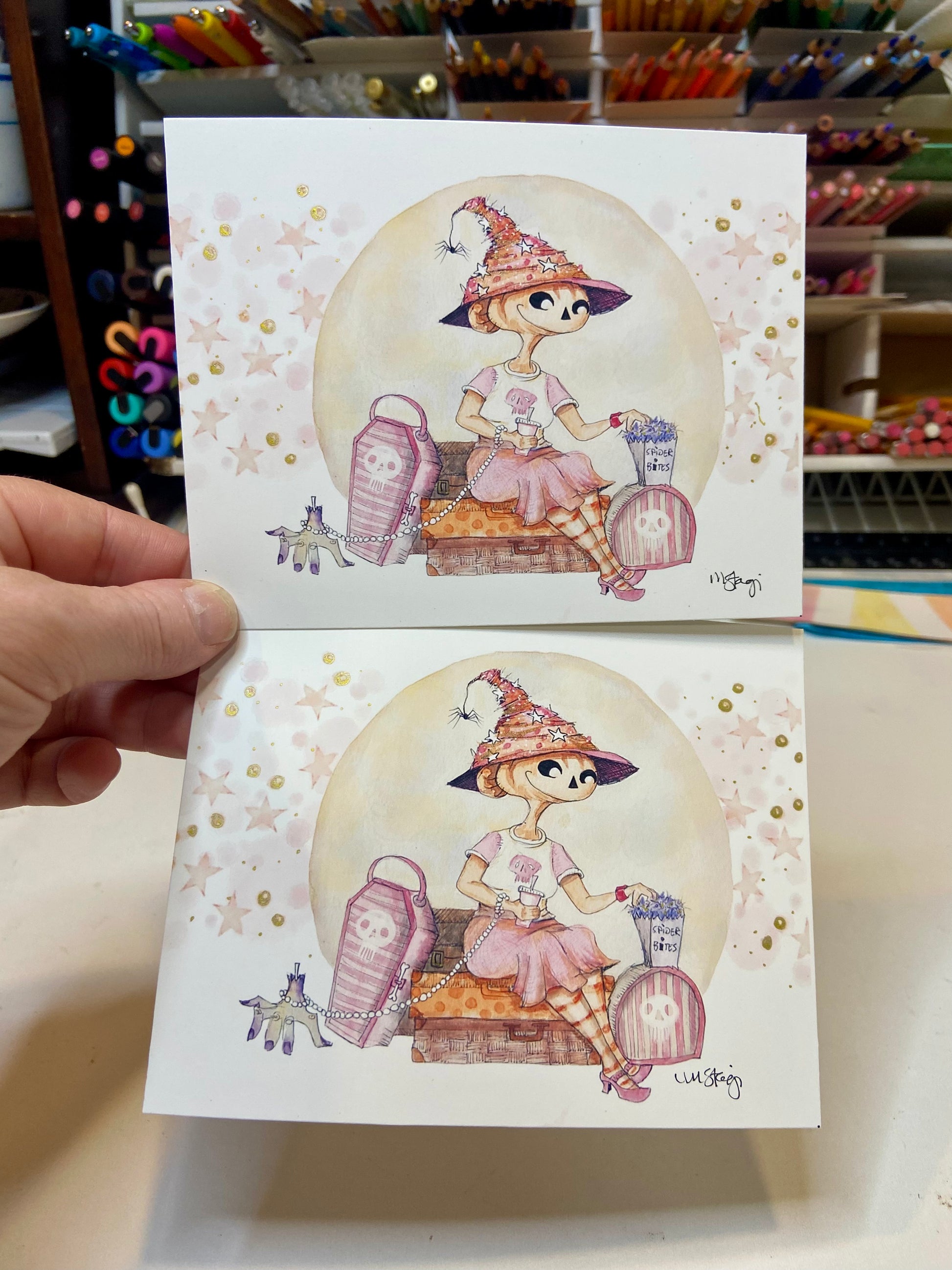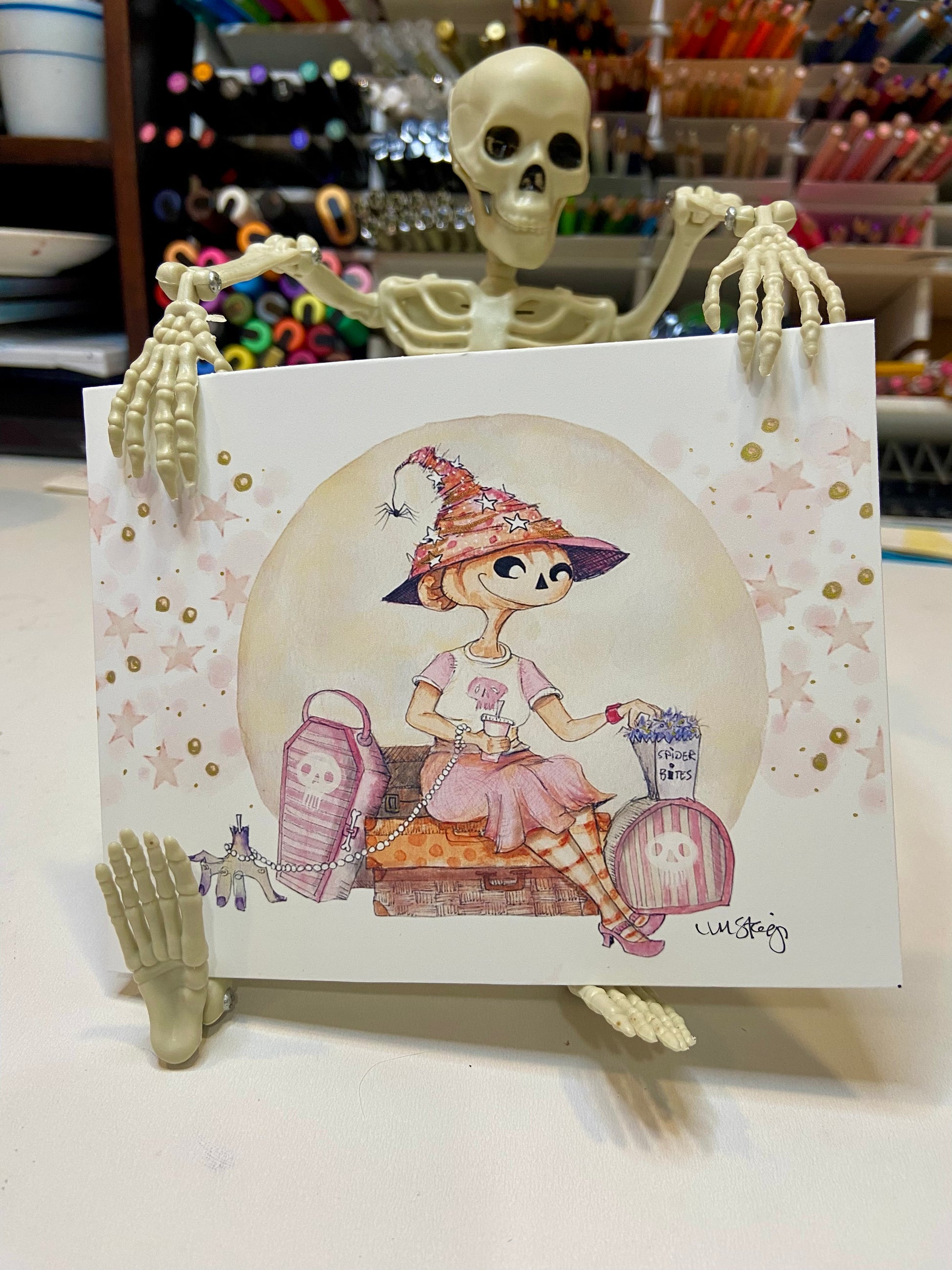 Capture the whimsical charm of Hattie the witch as she waits for the train on her spooky holiday adventure. This embellished print brings playful details to life, blending Halloween magic with a touch of travel excitement. Perfect for adding a unique, witchy vibe to your decor, it’s a fun celebration of Hattie’s journey and the spirit of Summerween.