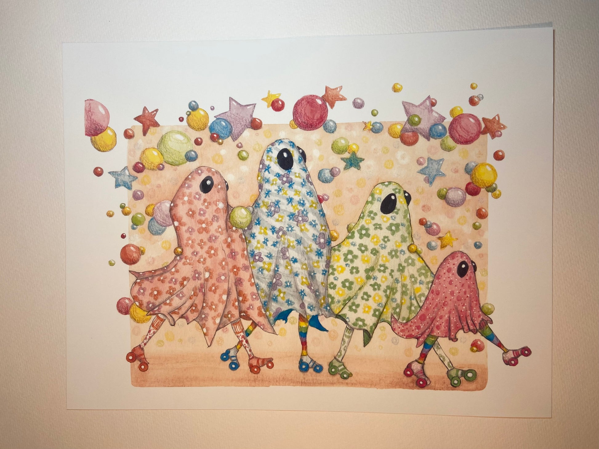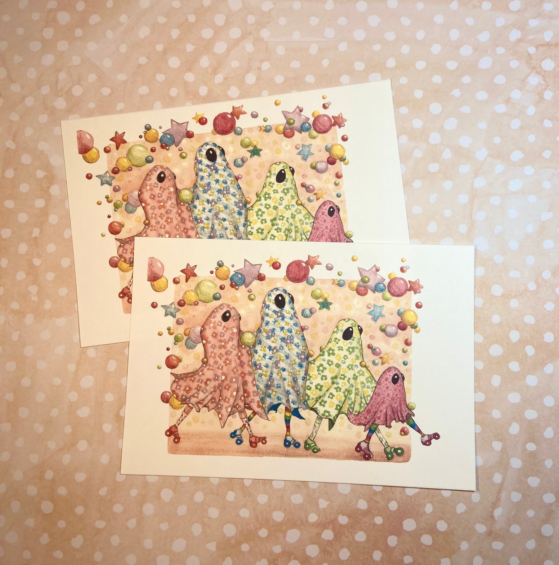Get into the Halloween spirit with our Skate Ghosts Prints! These spooky ghosts, decked out in vintage Halloween style, will add a playful touch to your decor. Perfect for anyone who loves fun and quirky art. (Boo-yah!)