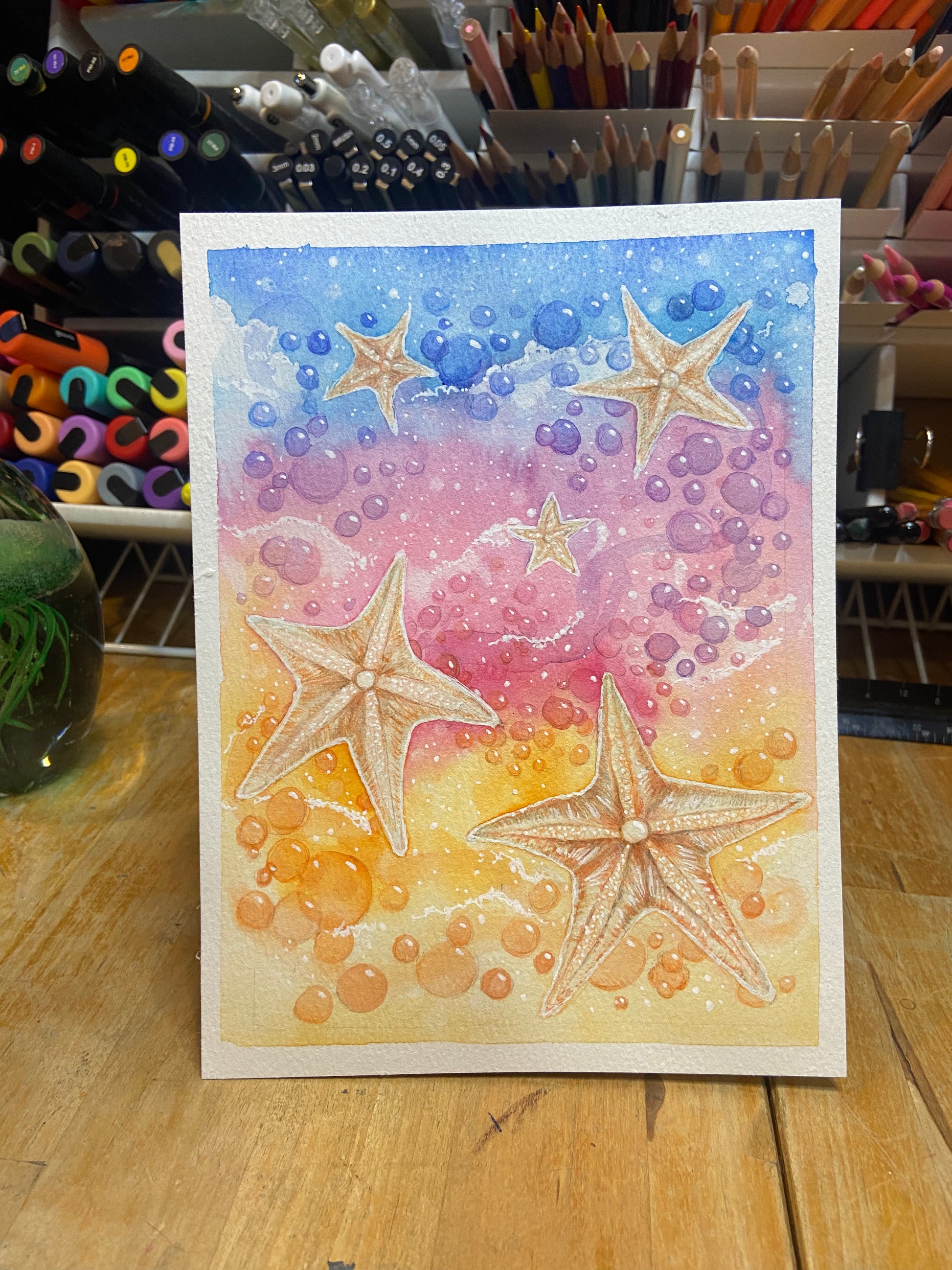 Dive into whimsy with this bright underwater scene! Featuring starfish, floating bubbles, and ocean magic, this original watercolor brings a splash of fun and calm to any space.