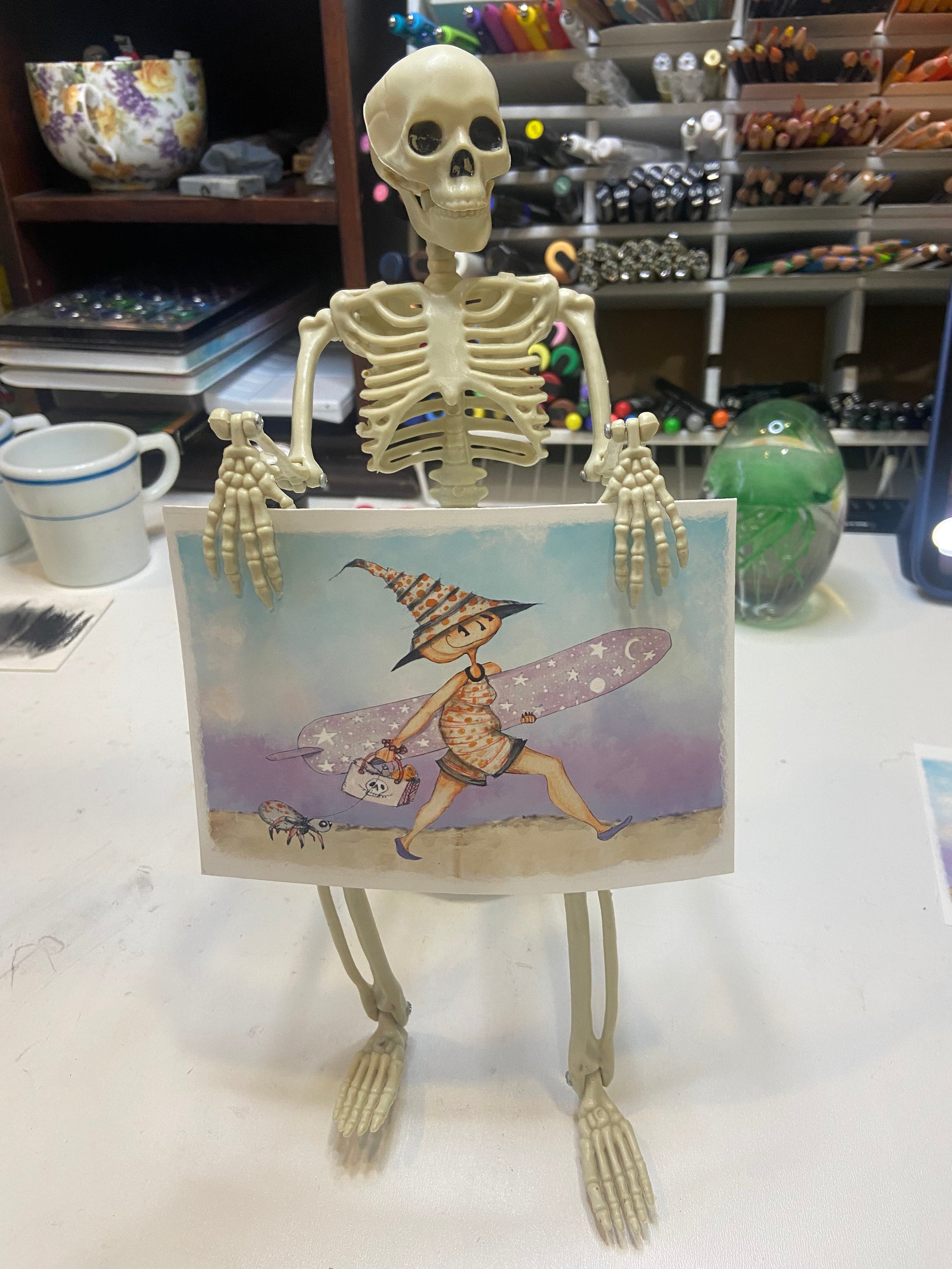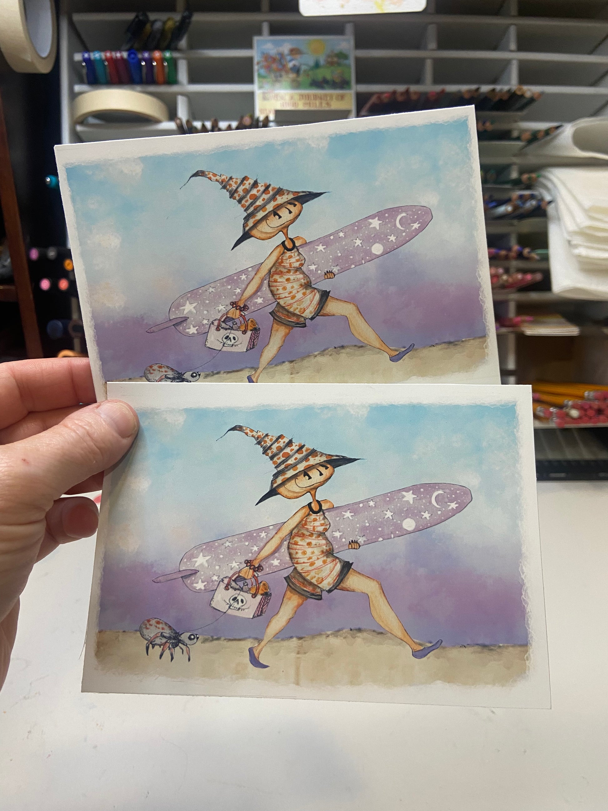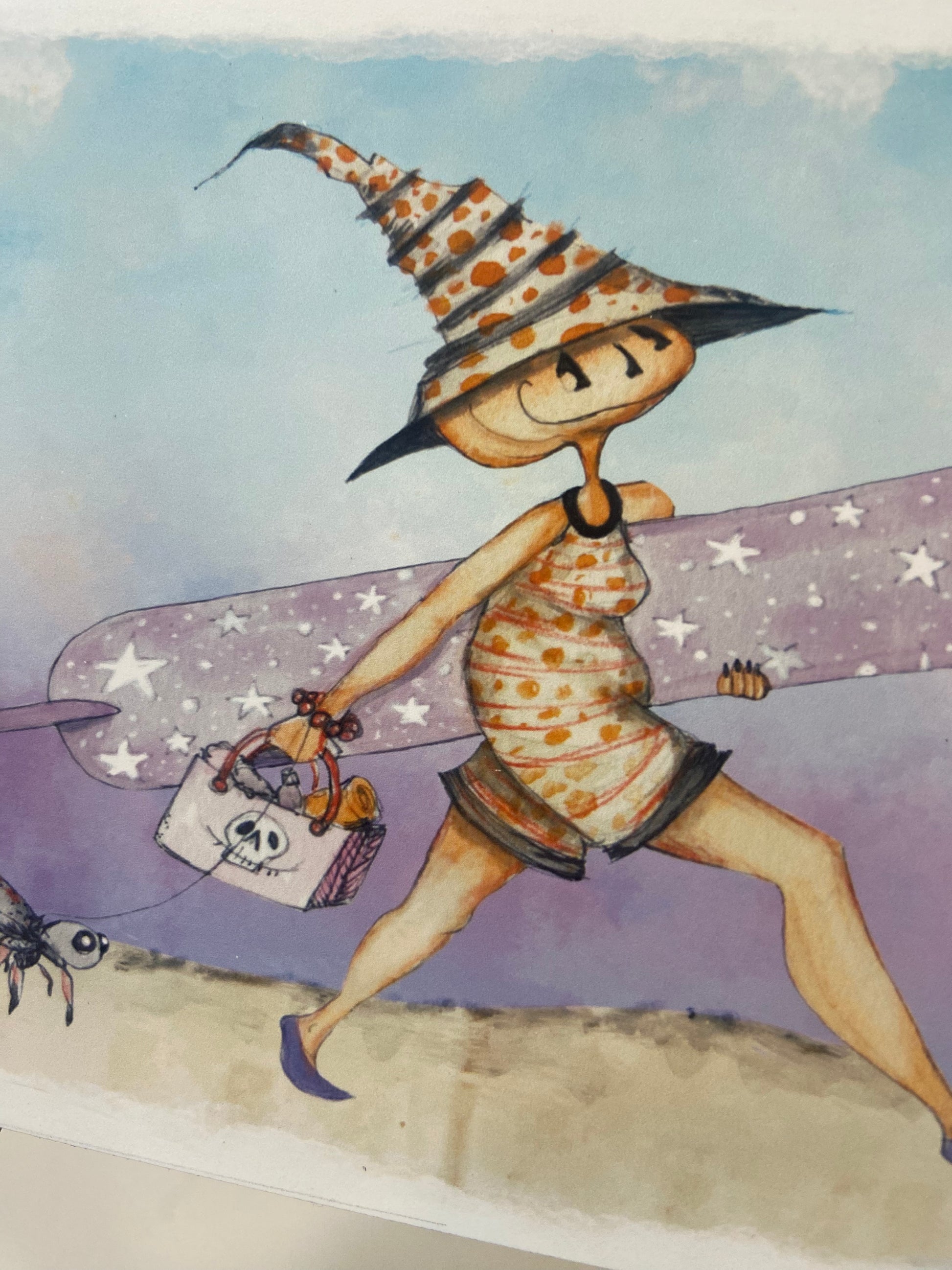 Embrace the spooky vibes of summer with this playful Surf Witch art piece! Featuring a witch ready to hit the waves with her trusty board and her quirky pet spider, this decor adds a fun, witchy twist to your Halloween or Summerween celebrations. Perfect for those who love a blend of spooky and sunny, it brings a unique charm to any space.