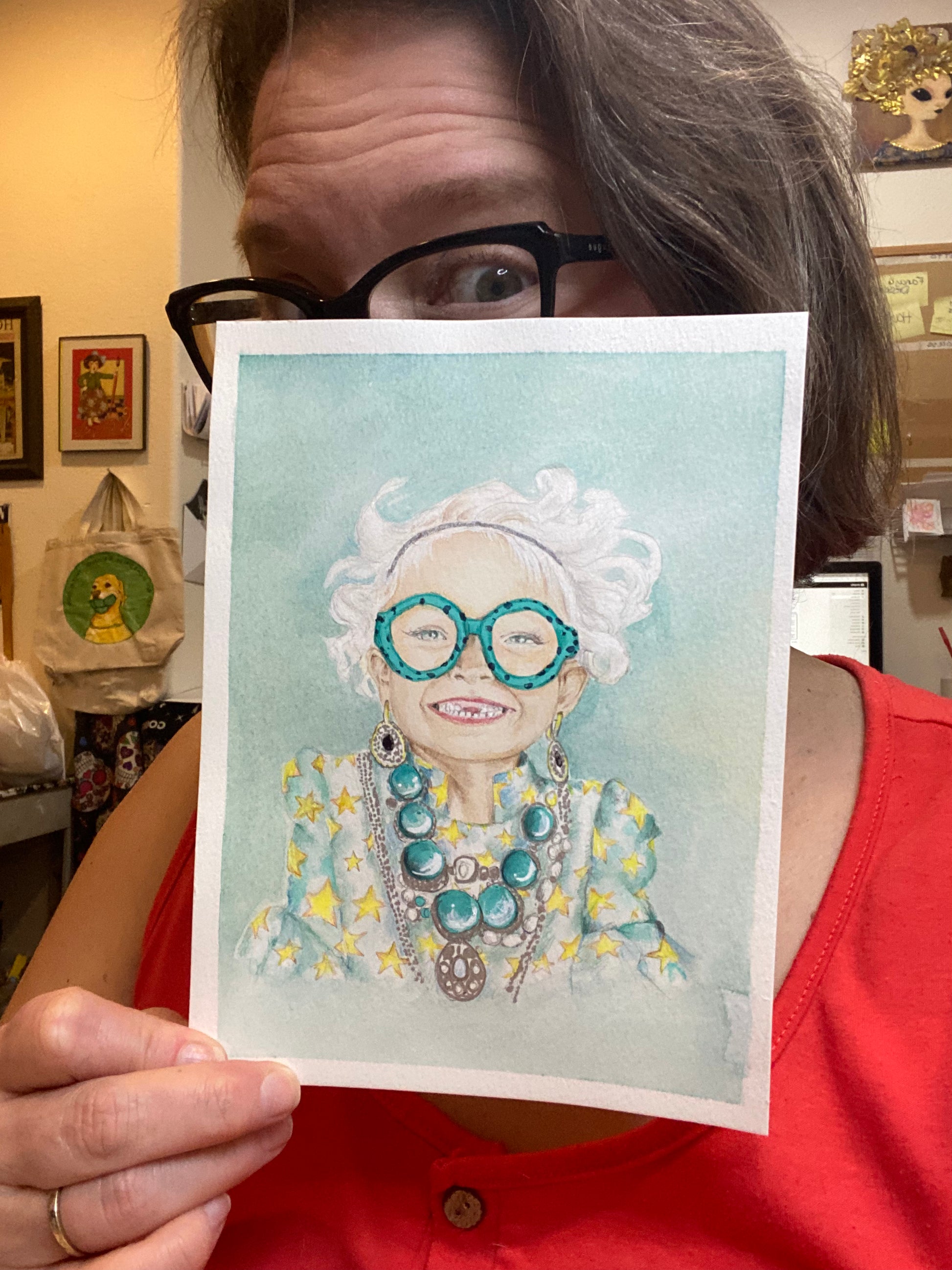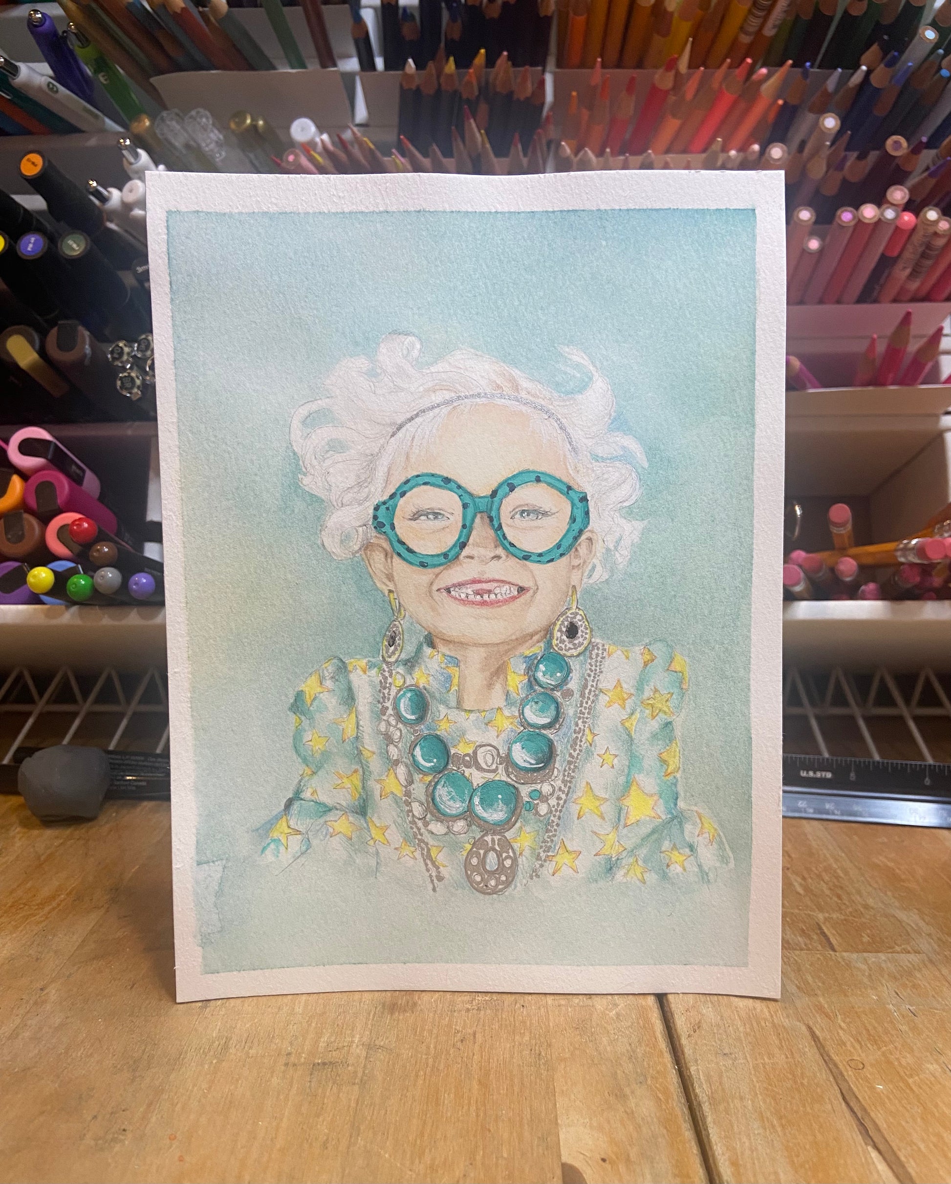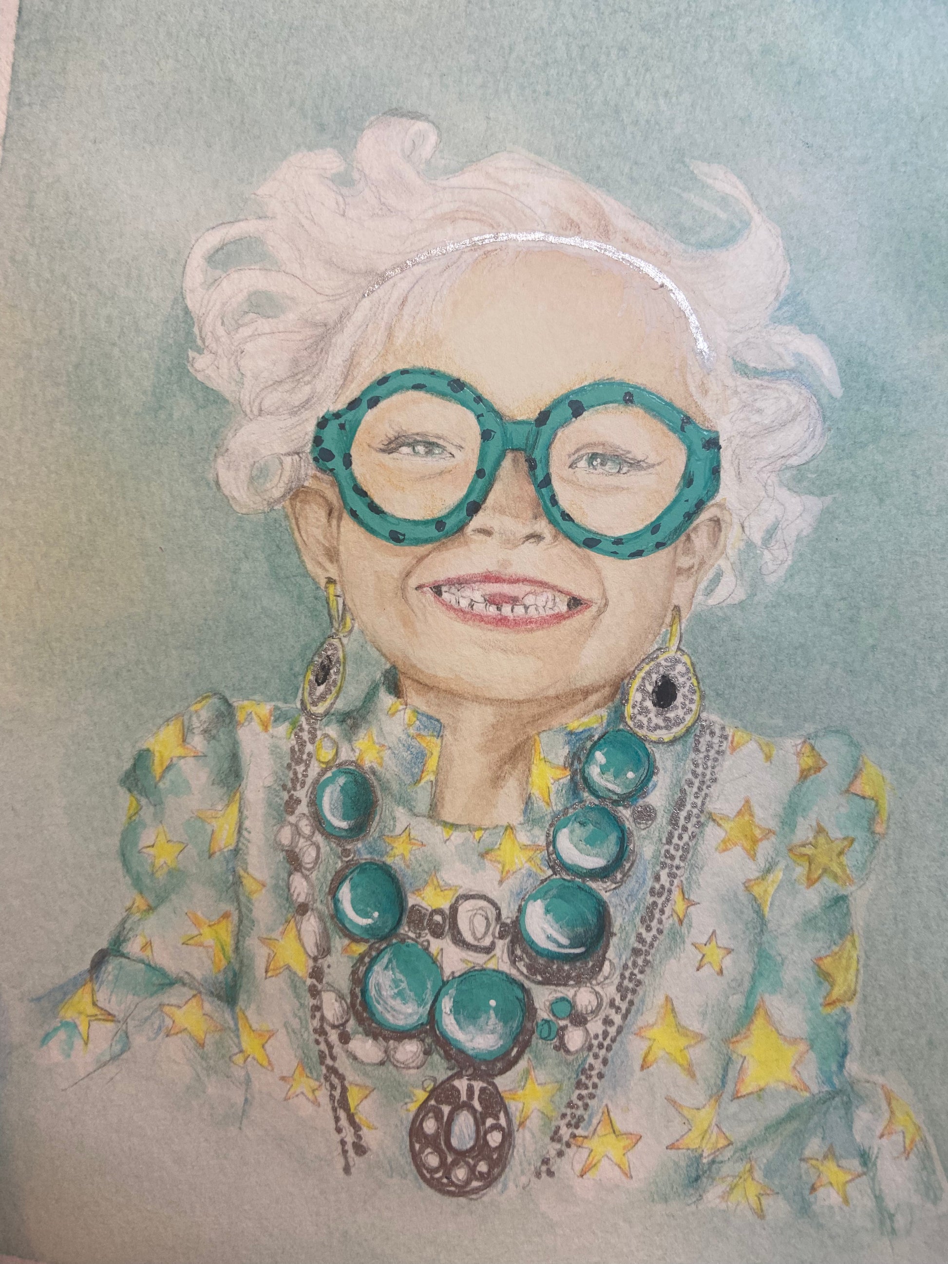 Whimsical Star Girl Portrait – White Blonde Hair & Glasses Cozy Bookish Watercolor Painting